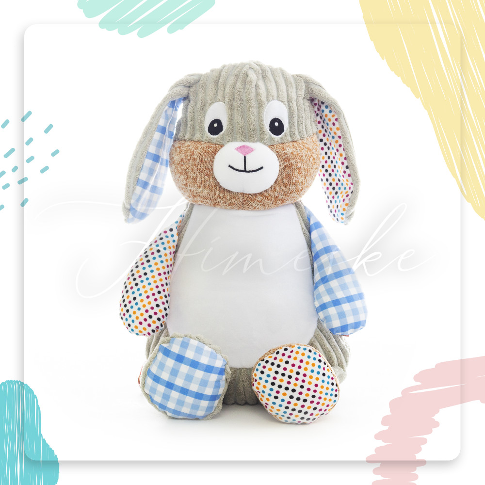 Ez a cuki, színes nyuszi 34 cm magas ülve, a hasa egyedi elképzelések alapján hímezhető. Fülei zörgős anyagból készültek.